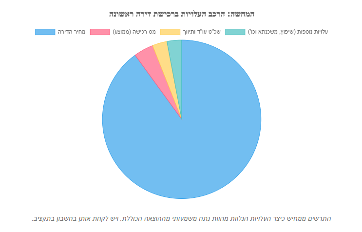 עלויות שיפוץ והתאמהמשתנה מאוד (10,000-150,000 ₪ ויותר)תלוי במצב הדירה. גם בדירה "משופצת" יש כמעט תמיד צורך בצביעה, תיקונים קטנים או התאמות.