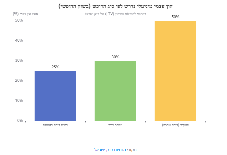 - משקיעים (רכישת דירה נוספת): כאשר מדובר ברכישת דירה שאינה יחידה או חליפית (כלומר, "דירה להשקעה"), המגבלות הן המחמירות ביותר. בנק ישראל רואה בעסקאות אלו סיכון גבוה יותר, ולכן מגביל את המימון ל-50% בלבד משווי הנכס. כתוצאה מכך, משקיעים נדרשים להון עצמי גבוה במיוחד של לפחות 50%.