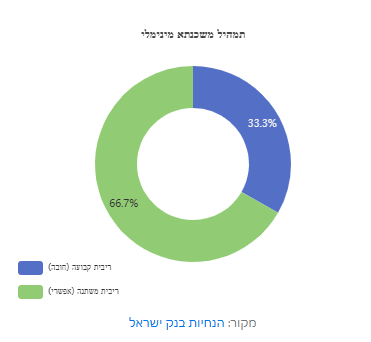 - תמהיל המשכנתא: כדי להגן על הלווים מפני תנודות חדות בריבית, קובע בנק ישראל כי לפחות שליש (33.3%) מסכום המשכנתא הכולל חייב להילקח במסלול של ריבית קבועה (צמודה או לא צמודה למדד). כפועל יוצא, לא ניתן לקחת יותר משני שליש מההלוואה במסלולים המבוססים על ריבית משתנה (כגון ריבית פריים).