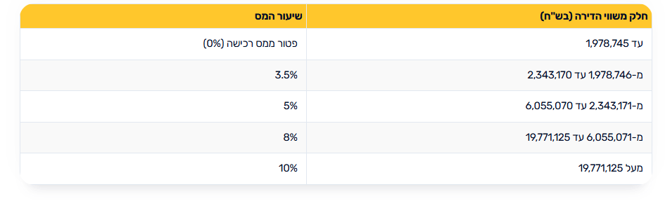 לרוכשי דירה יחידה: זוהי ההטבה המשמעותית ביותר. נכון לשנת 2025, רוכש דירה יחידה זכאי לפטור מלא ממס רכישה על חלק השווי שאינו עולה על כ-1,978,000 ש"ח. החיסכון יכול להגיע לעשרות אלפי שקלים. על חלק השווי שמעל תקרת הפטור ועד כ-2.34 מיליון ש"ח, חל מס מופחת של 3.5%, וכן הלאה במדרגות. חשוב להדגיש: ההטבה ניתנת למי שבבעלותו דירה יחידה במועד הרכישה, גם אם בעבר היו בבעלותו דירות אחרות.