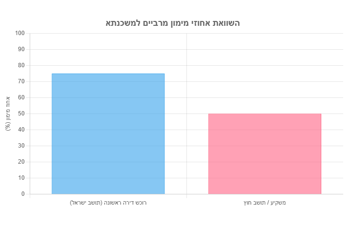 זהו ההבדל המשמעותי והבולט ביותר בין משכנתא לתושב חוץ לזו של תושב ישראל. אחוז המימון, או יחס ה-LTV (Loan-to-Value), קובע איזה חלק ממחיר הנכס הבנק מוכן לממן, וכמה הון עצמי על הרוכש להביא "מהבית".
